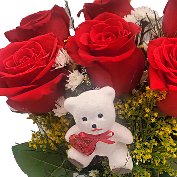 6 Rosas vermelhas, Pelúcia, folhagens verdes e Vaso de vidro.